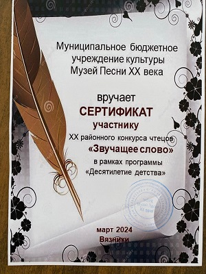 Ежегодно в марте проводится районный конкурс "Звучащее слово". Вот и в этом году традиционно прошёл ХХ районный конкурс чтецов "Звучащее слово" в рамках "Десятилетие детства". В умении выразительно, эмоционально и артистично прочитать стихотворения соревновалось много конкурсантов. Воспитанницы нашего детского сада также участвовали в этом конкурсе. Это было их первое выступление на таком уровне. Но они справились с волнением, хотя итоги конкурса ещё не подведены, мы поздравляем Аню Новикову и Аню Смирнову с достойным выступлением. Молодцы!!!Участники конкурса были награждены сертификатами.